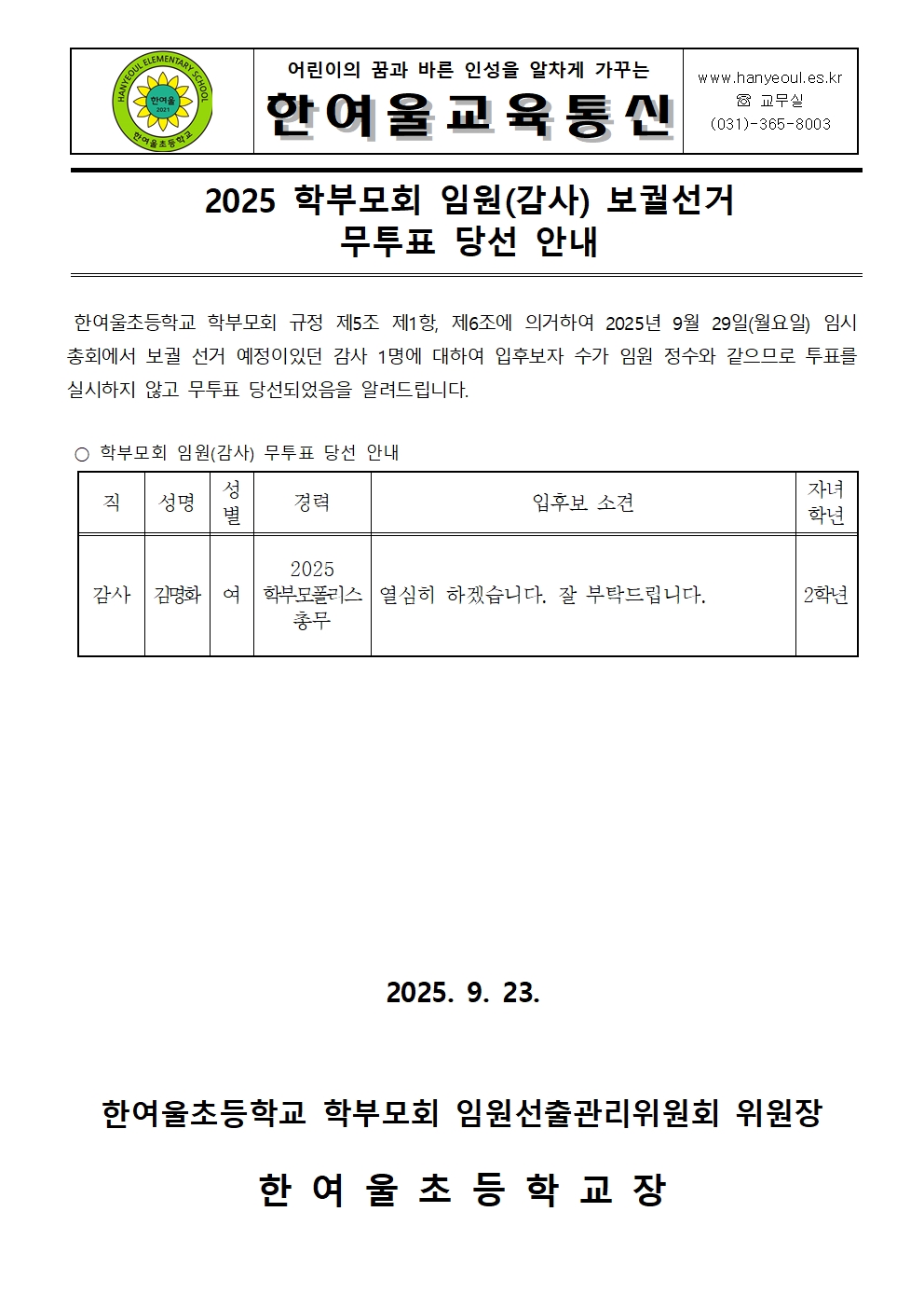 ÇÑ¿©¿ïÃʵîÇб³ Çкθðȸ ÀÓ¿ø º¸±È¼±°Å °ø°í